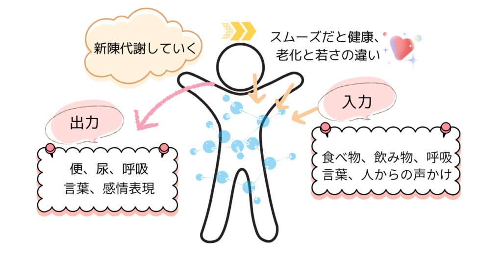 出力とは、便や尿、呼吸、運動エネルギー、言葉、感情表現や自己表現など。